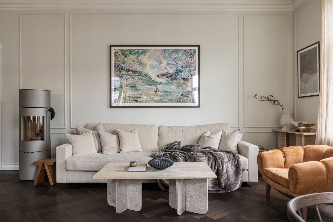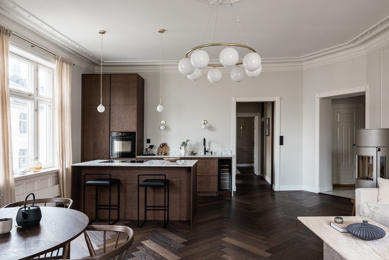 – Det var ikke enkelt å legge gjennomgående parkett uten dørterskel i en bygårdsleilighet fra 1898. For det første var gulvet skjevt, og det måtte et par runder med avrettingsmasse. Så hadde vi fiskebensparkett som måtte følge sitt mønster, men original veggene i boligen er skjeve så det ble mye kapp for å få et gjennomført uttrykk.