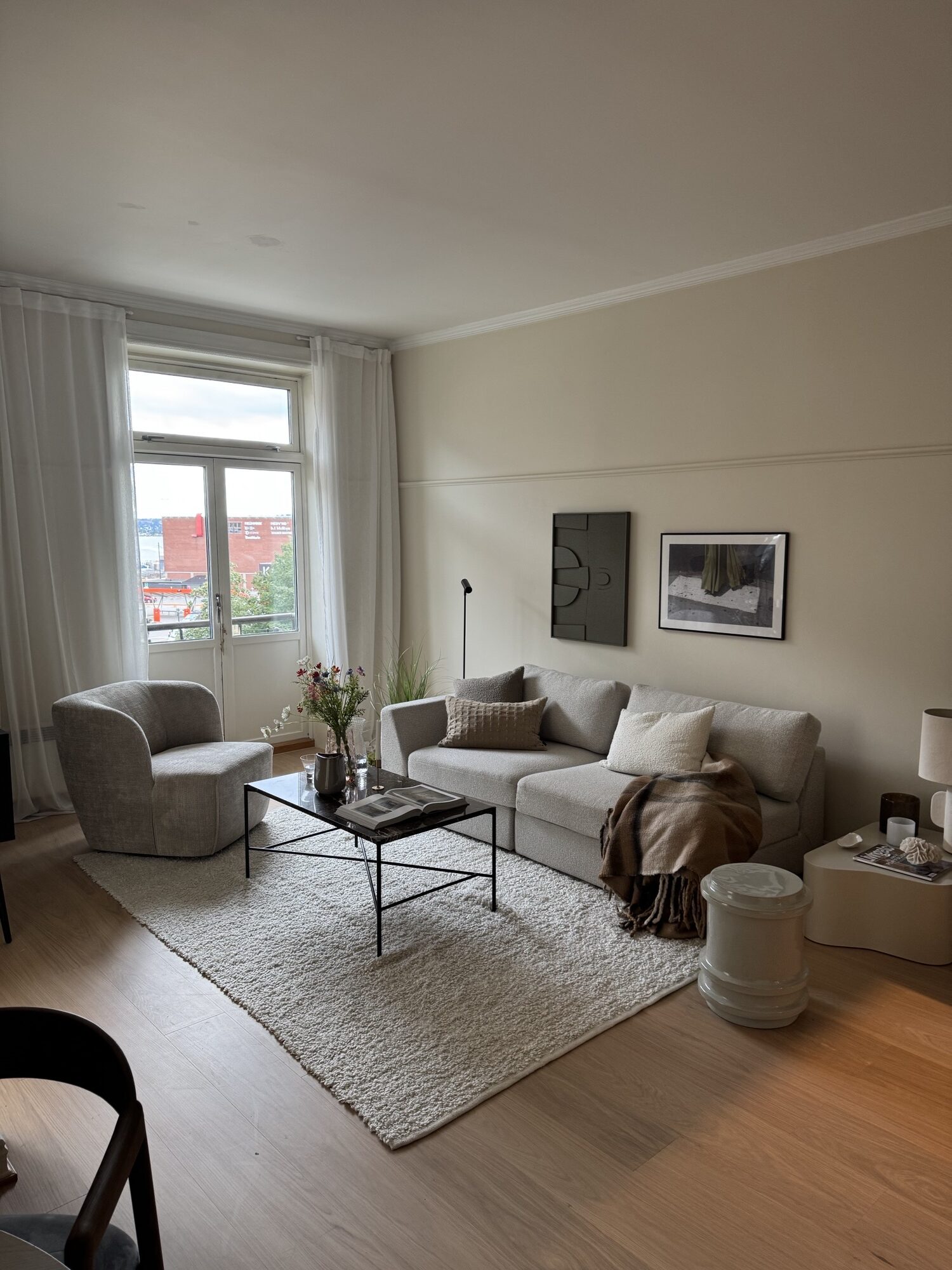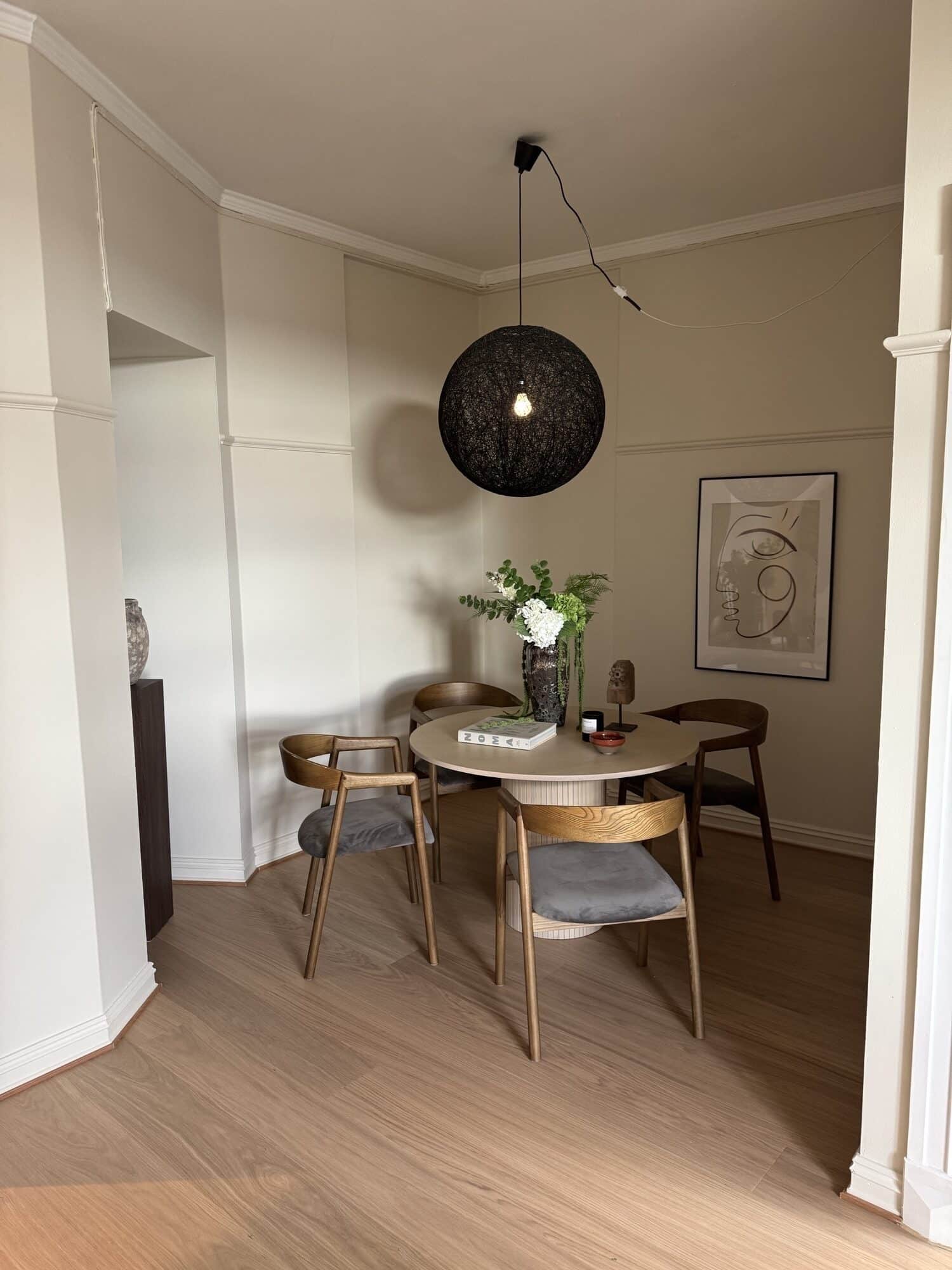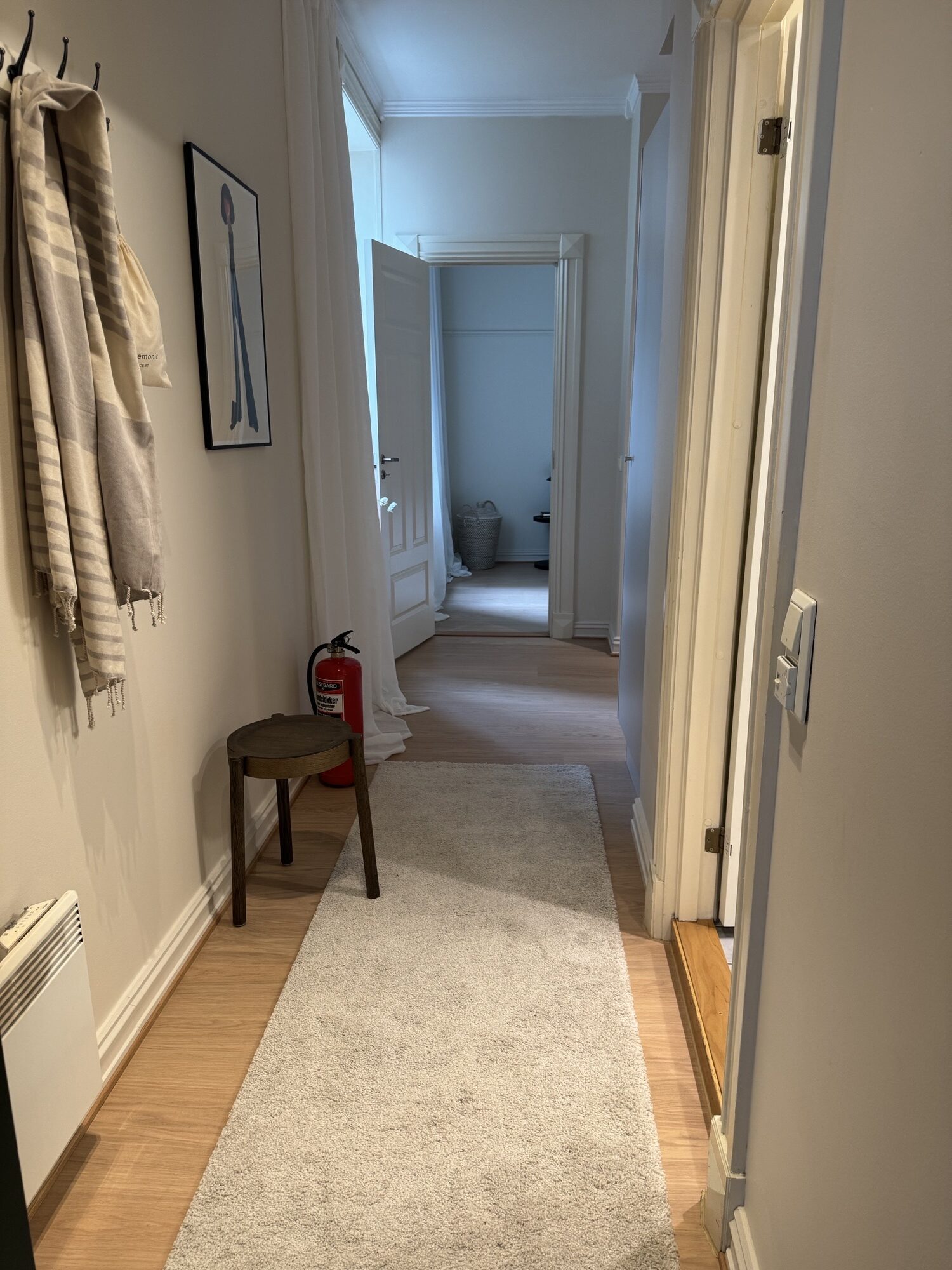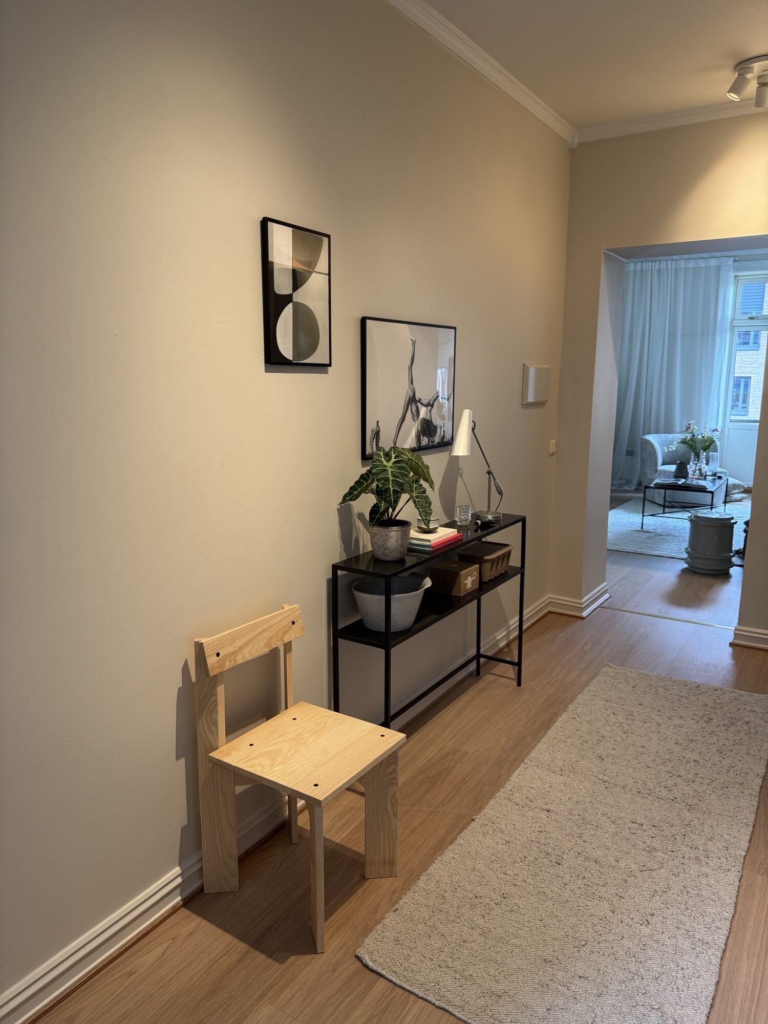 Leiligheten fremstår helhetlig og lun, med lyse vegger, hvite tak og lister som binder rommene sammen. Kjøkkenet ligger som en rolig, funksjonell sone mot stue. Badet er fornyet med malte fliser og ny møblering. Dører og detaljer fremstår rene og tidsriktige.