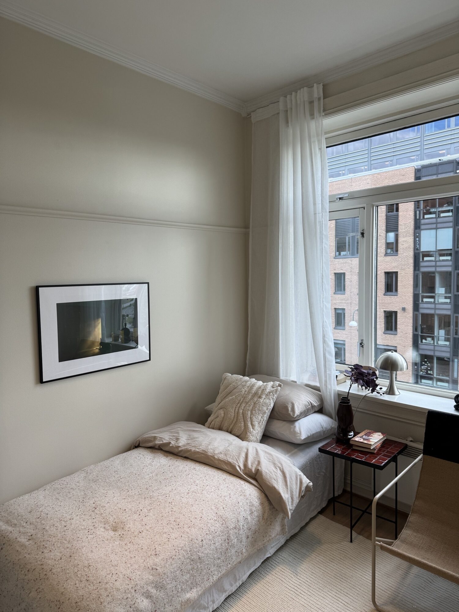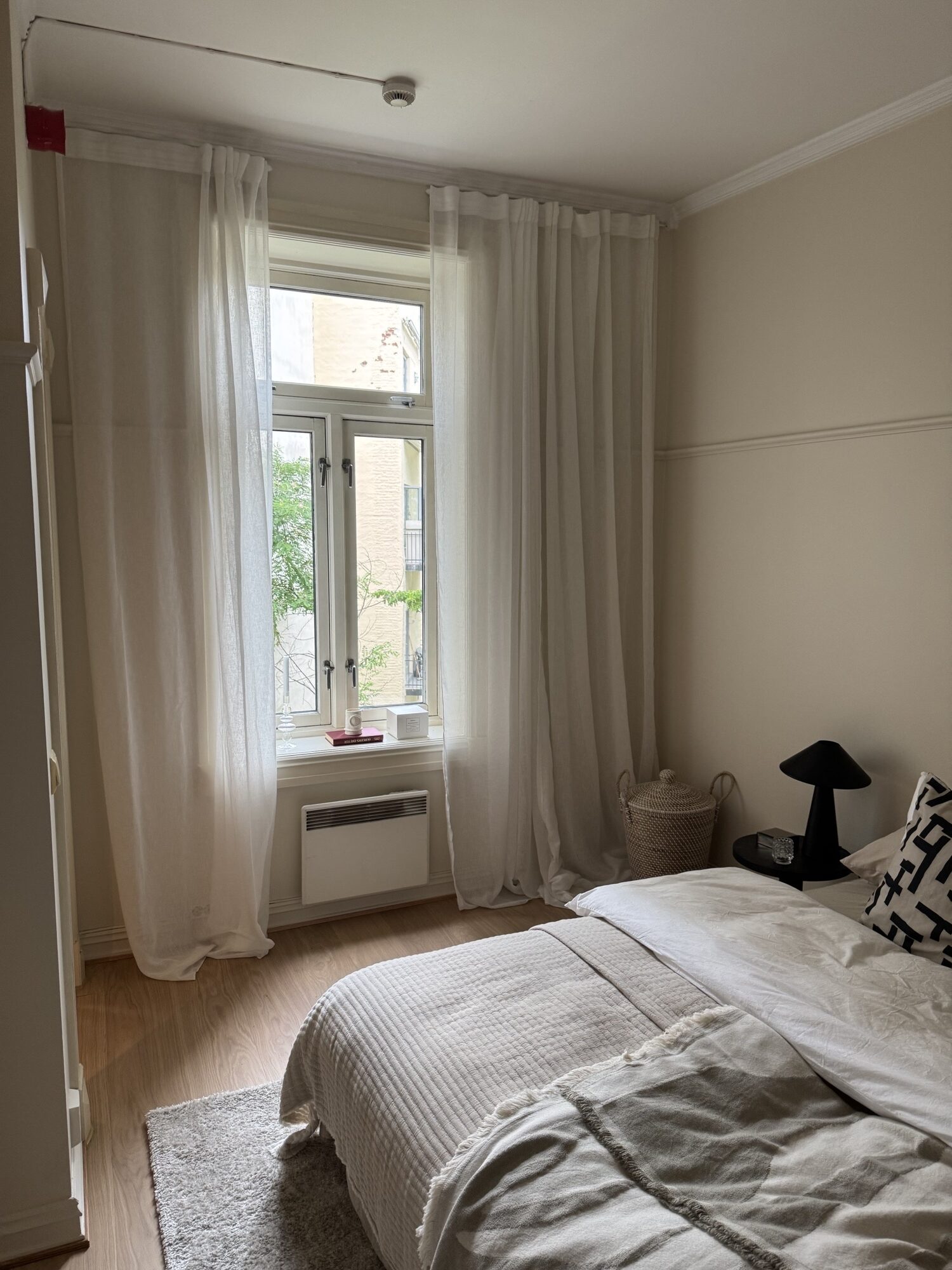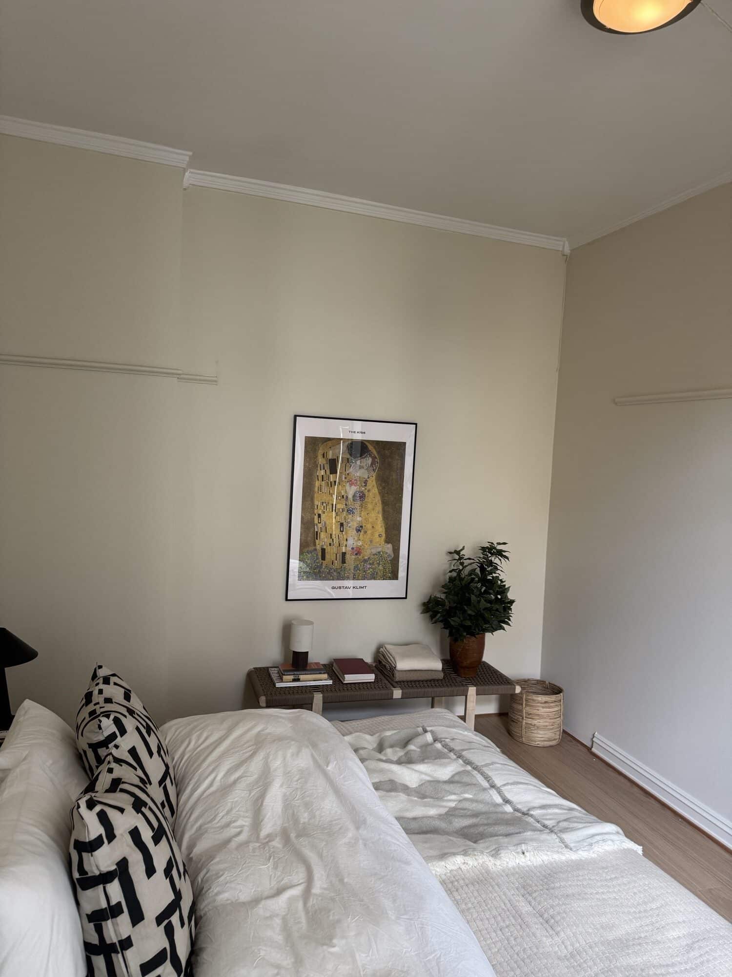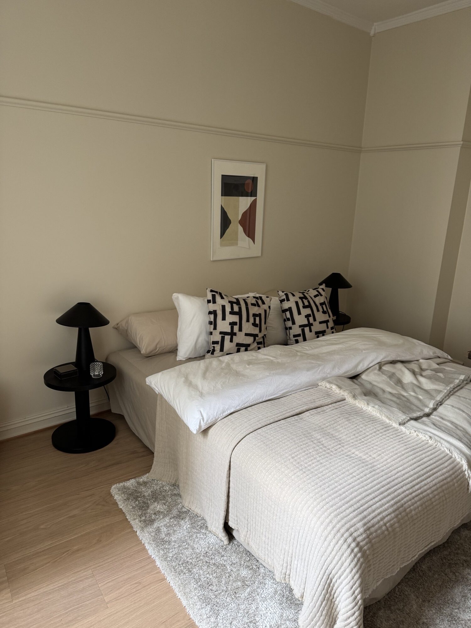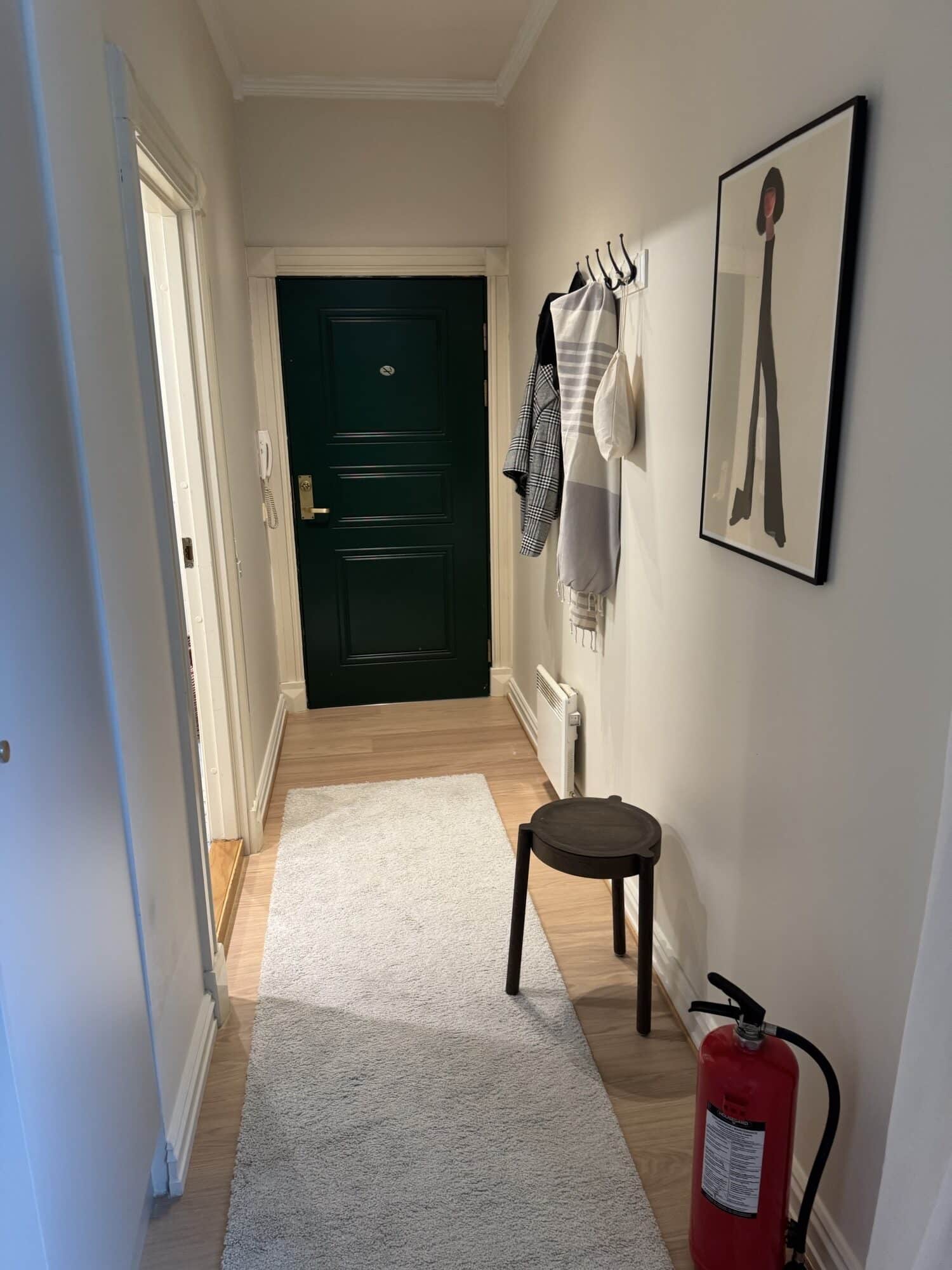 Leiligheten fremstår helhetlig og lun, med lyse vegger, hvite tak og lister som binder rommene sammen. Kjøkkenet ligger som en rolig, funksjonell sone mot stue. Badet er fornyet med malte fliser og ny møblering. Dører og detaljer fremstår rene og tidsriktige.