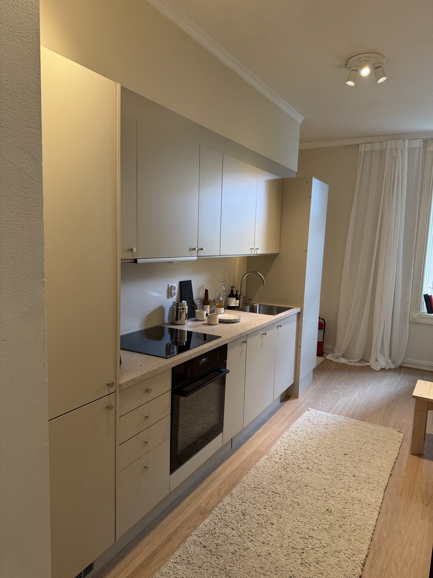 - Montering av enlinjekjøkken med integrerte hvitevarer, jevn benkeplate og overskap i samme fargetone som vegger.
