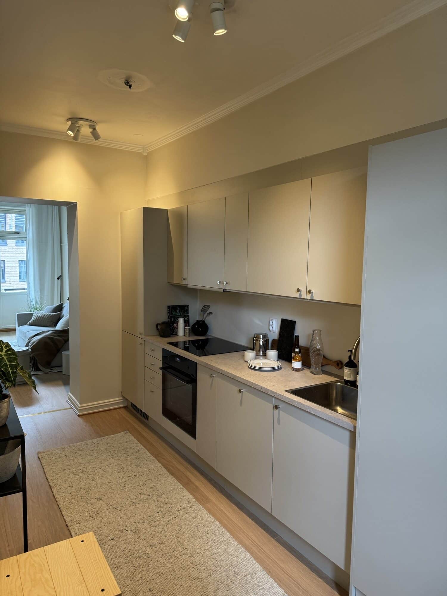 Kunden ønsket en helhetlig oppfriskning av leiligheten, med tydeligere sammenheng mellom rommene og et roligere uttrykk. Arbeidet omfattet maling av vegger og tak i alle oppholdsrom, oppgradering av bad gjennom flismaling og nytt utstyr/møbler, montering av nytt enlinjekjøkken – samt utskiftning/montering av nye innerdører.